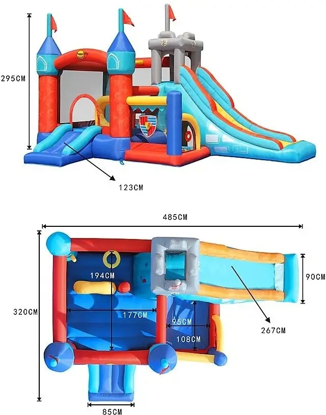 S rozměry 4,85 x 3,2 x 2,95 m a plochou 15,5 m² nabízí dostatek prostoru pro až 6 dětí současně, přičemž maximální váha jednoho dítěte nesmí přesáhnout 30 kg. Celková nosnost atrakcí je až 150 kg, což umožňuje zábavu pro více dětí najednou. Tento hrad je nejen zábavný, ale i bezpečný, což z něj činí skvělé řešení pro každou rodinnou akci. Dopřejte dětem nezapomenutelné zážitky plné smíchu a radosti s Královským hradem!
